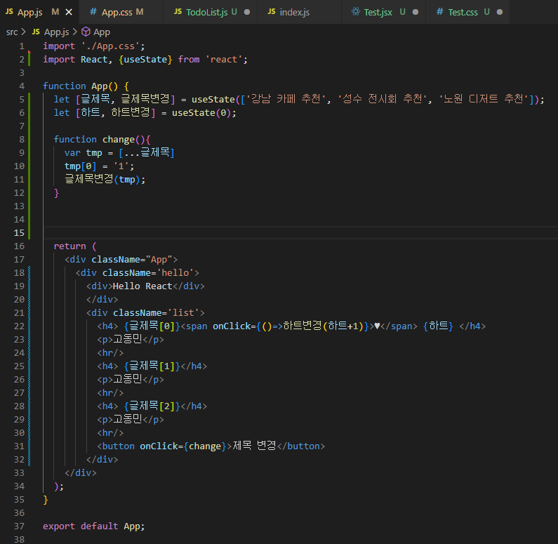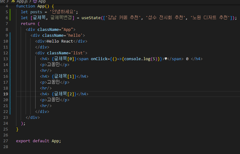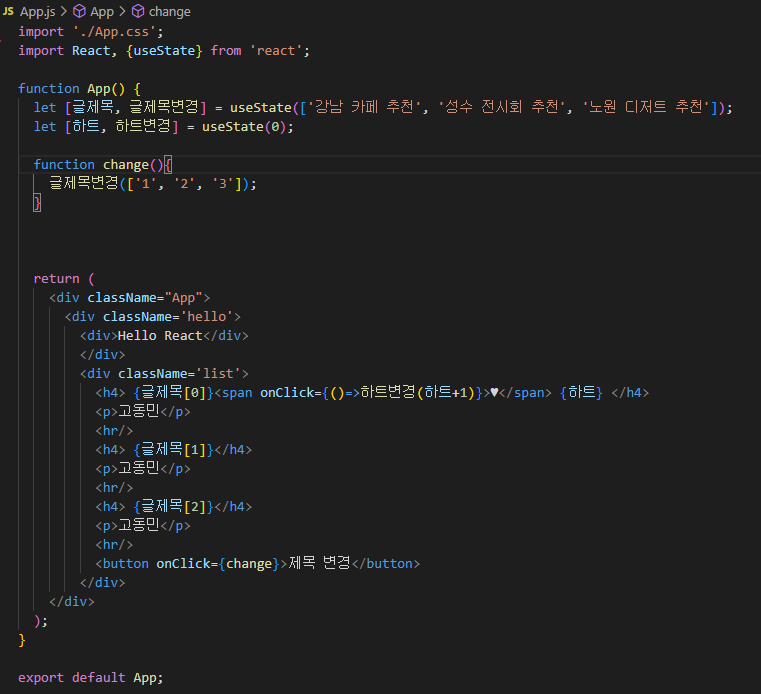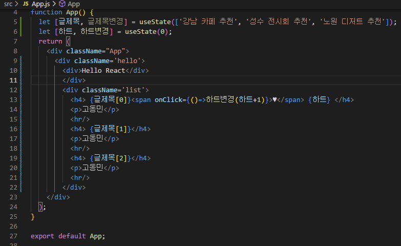 이때 onClick에는 state의 하트변경 함수를 이용하여 하트+1을 해줍니다.