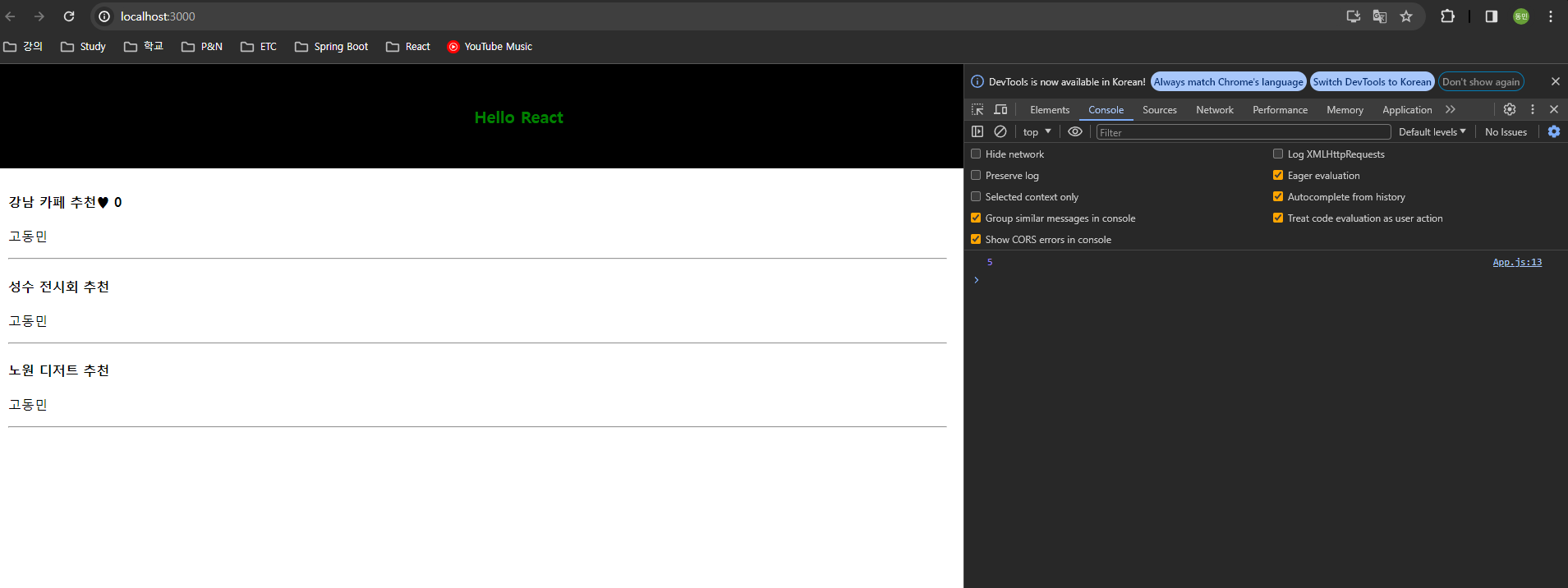 위와 같이 작성하면 아래와 F12를 눌러 콘솔창을 보면 아래와 같이 5가 출려됩니다.