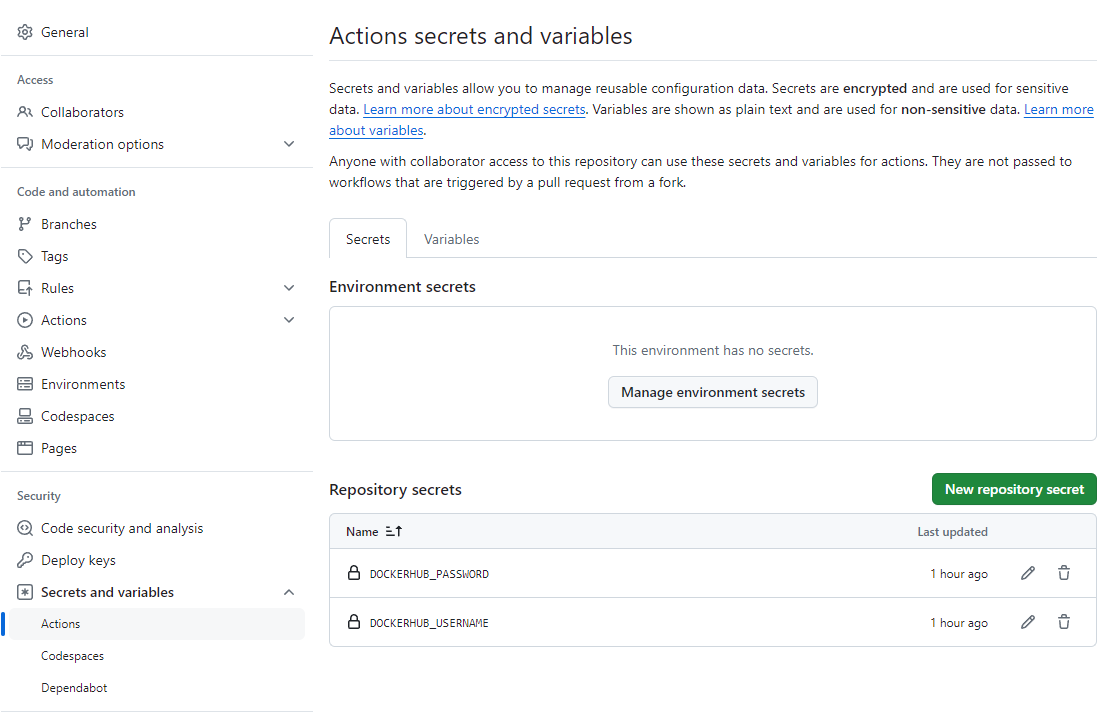 그리고 Settings -> Secrets and variables -> Actions에 Docker Hub의 username과 password를 추가해줍니다.