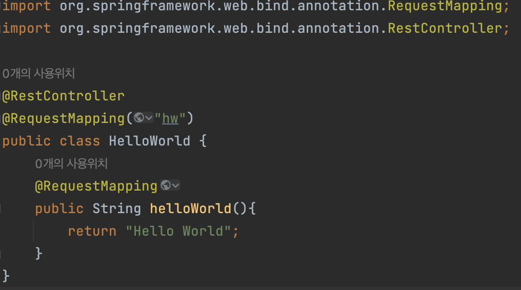 그리고 위와 같이 코드를 입력해주고 실행시키고 주소창에 localhost:8080/helloWorld/getMethod라고 입력해주면 Hello World가 뜬다.