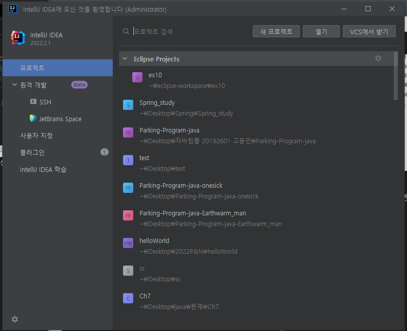 우선 Intellij를 실행시키고 "새 프로젝트"를 누른다