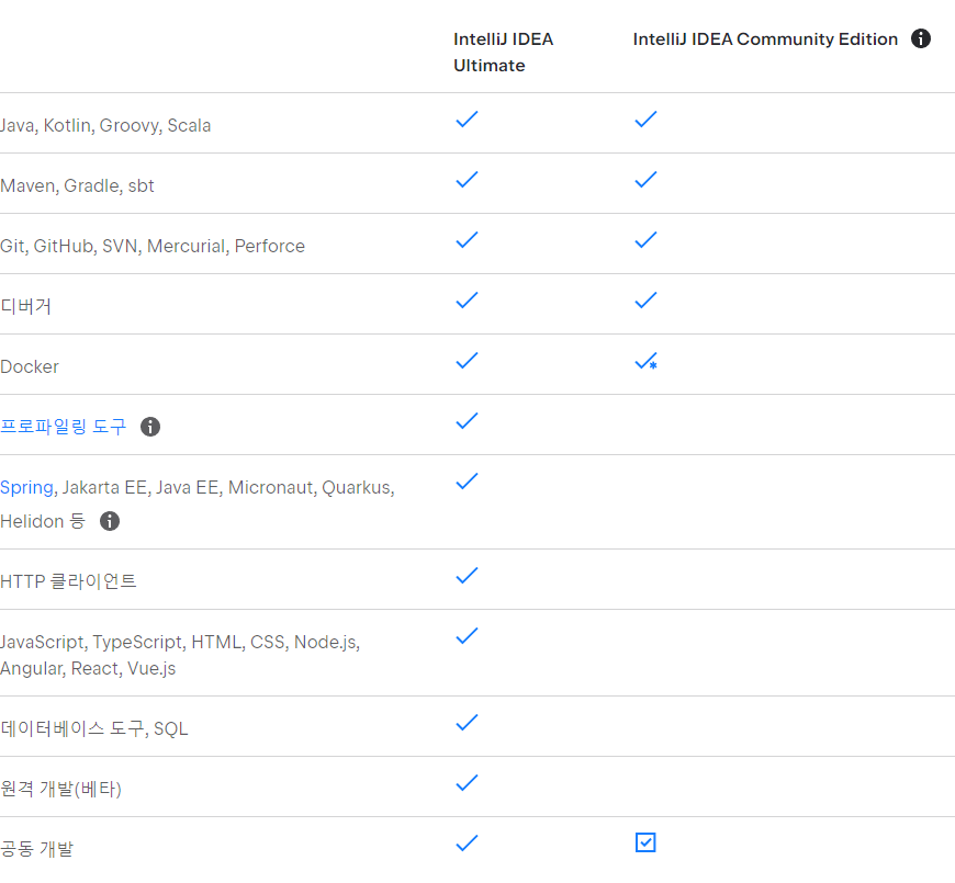 구글에 Intellij를 검색해 들어가면 Community버전과 Ultimate버전이 있다. 두 버전은 아래 그림과 같이 기능 차이가 많이 난다.