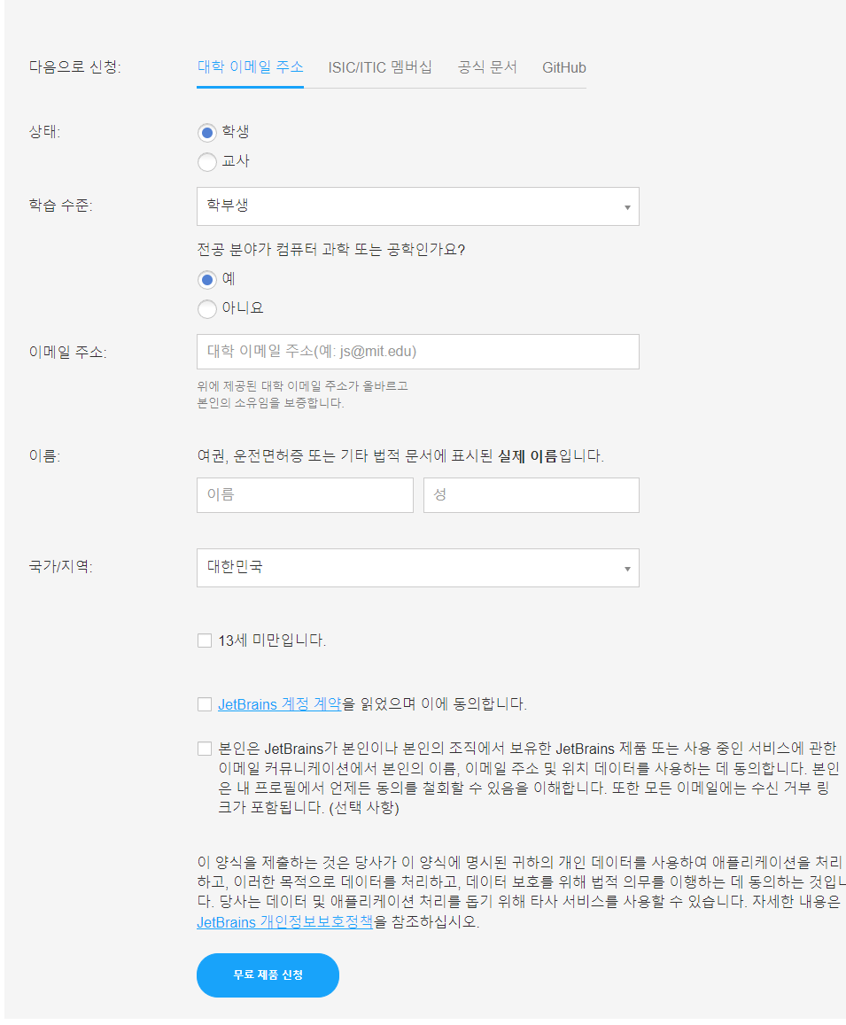 우선 www.jetbrains.com/community/education/#students 다음 사이트로 들어가서 아래에 Apply now 파란 버튼을 누른다.