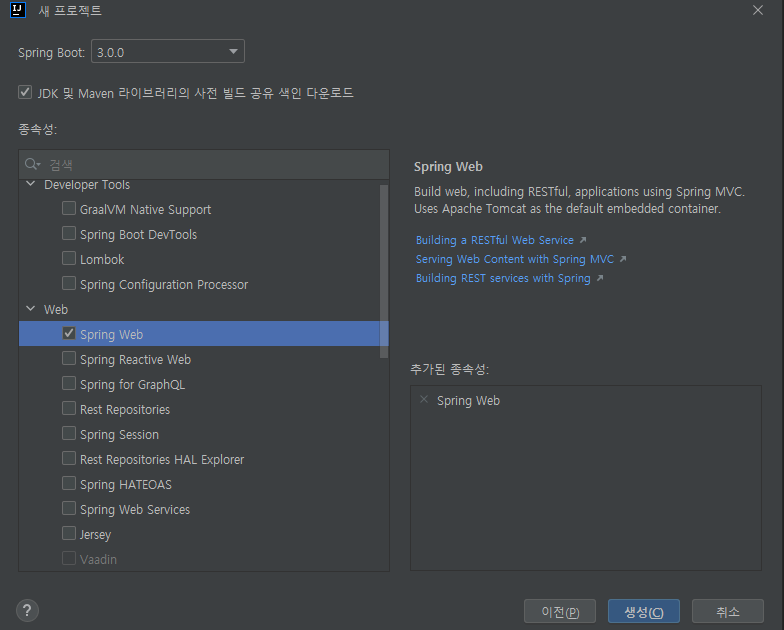 Web->Spring Web만 체크해주고 생성을 눌러준다.