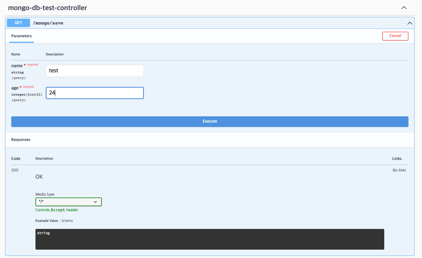 name과 age를 입력하고 Execute해주면 데이터가 잘 들어가 있는 것을 볼 수 있다!